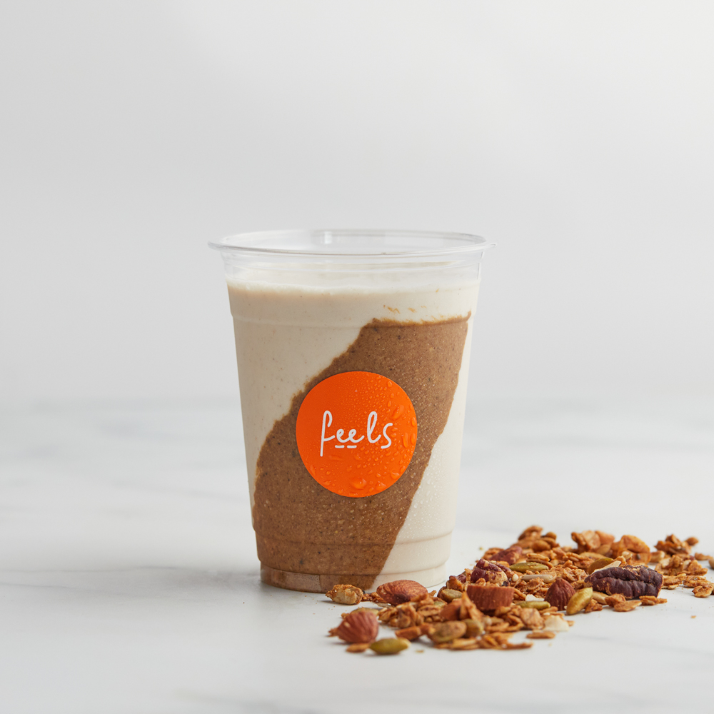 Homemade Granola butter, frozen banana, vanilla vegan ice cream, maple syrup